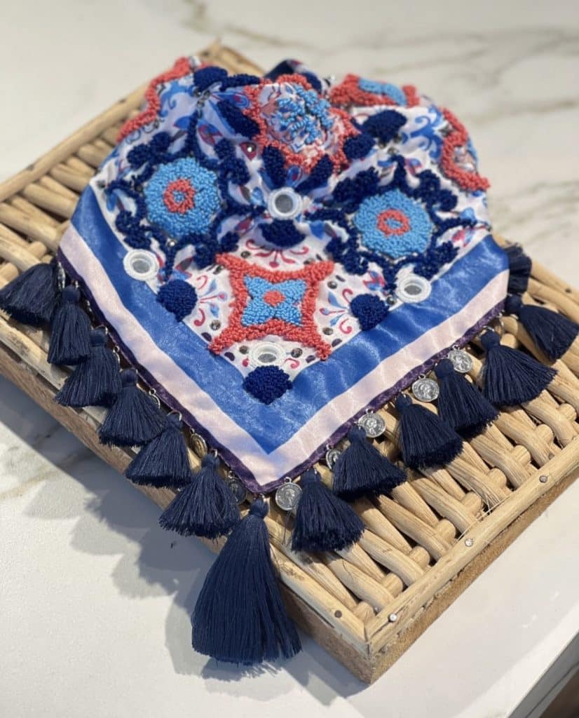 Pañoleta bordada a mano. Tela seda satinada. Espejos en croché Borlas hechas a mano Bordado hecho a mano Detalles en piedras color plomo Dijes en níquel plateado.