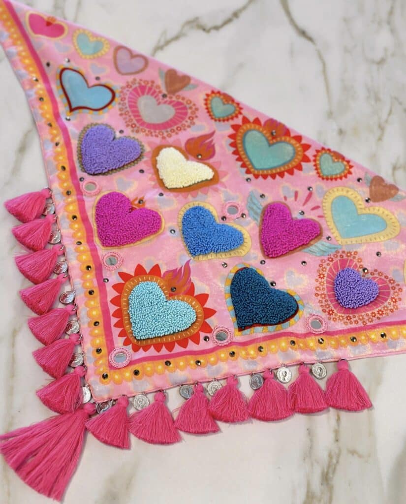 Pañoleta bordada a mano. Descripción: Tela seda satinada. Espejos en croché Borlas hechas a mano Bordado hecho a mano Detalles en piedras color plomo Dijes en níquel plateado.