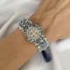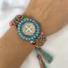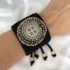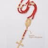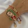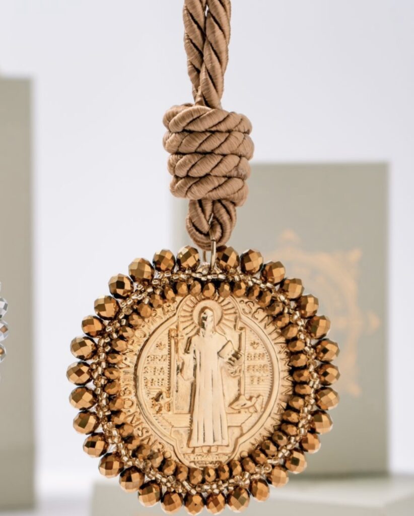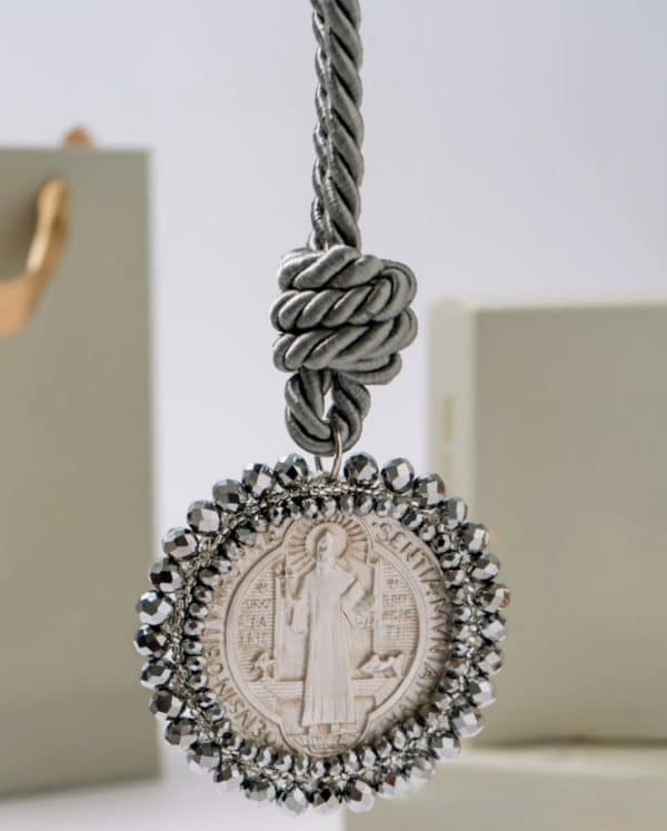 Materiales: Placa de San Benito en acero pesado, recamada con piedra: mostacilla, rondel y cristal murando.