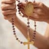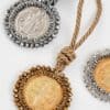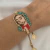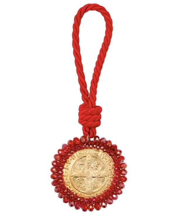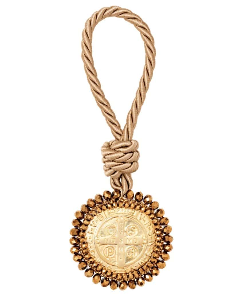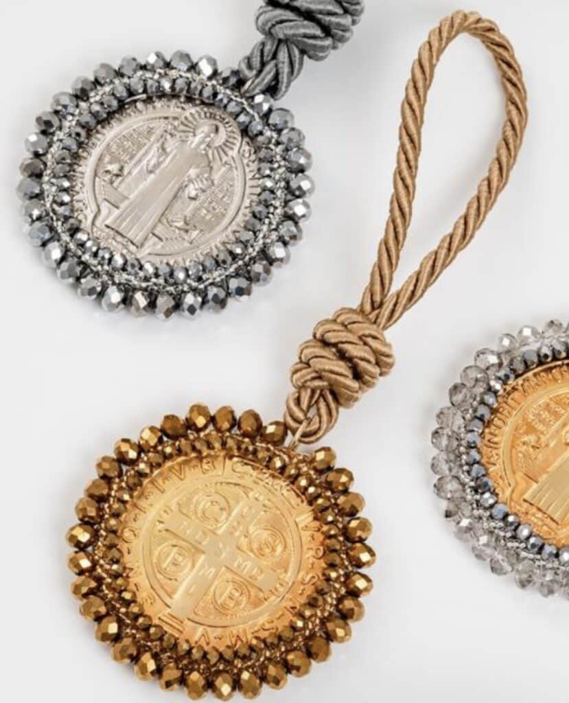 Materiales: Placa de San Benito en acero pesado, recamada con piedra: mostacilla, rondel y cristal murando.